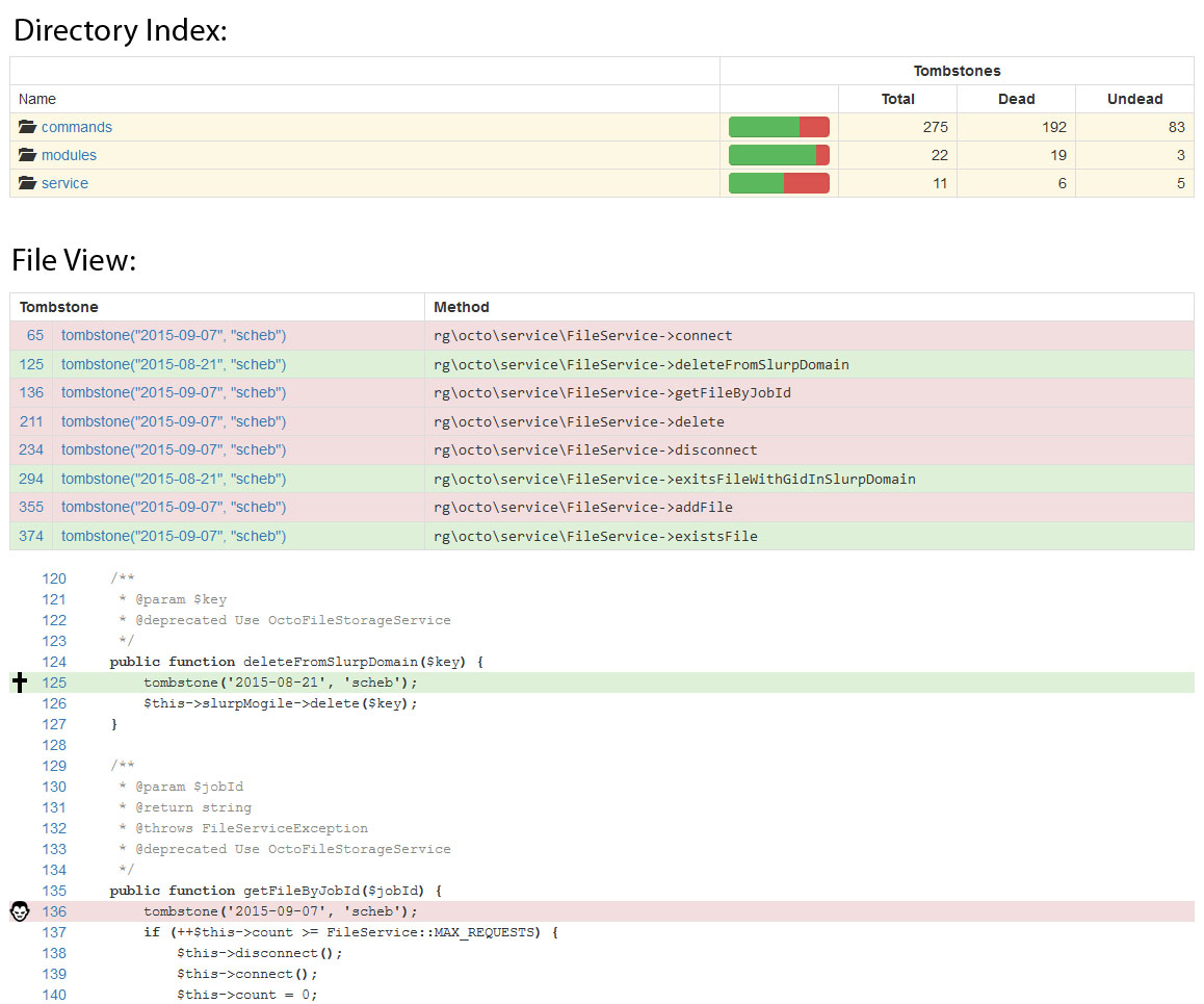 The tombstone-analyzer is a command line tool, which aggregates the log files and creates a textual overview of all tombstones, their invokers (if any), their age and other useful information. It can also create a HTML report, which is the more useful one in my opinion, similar to what PHPUnit is doing for code coverage (the template is pretty much the same, thanks to Sebastian Bergmann, who allowed me to re-use it). In the HTML report you can browse the source code and find the tombstones highlighted as dead or undead.